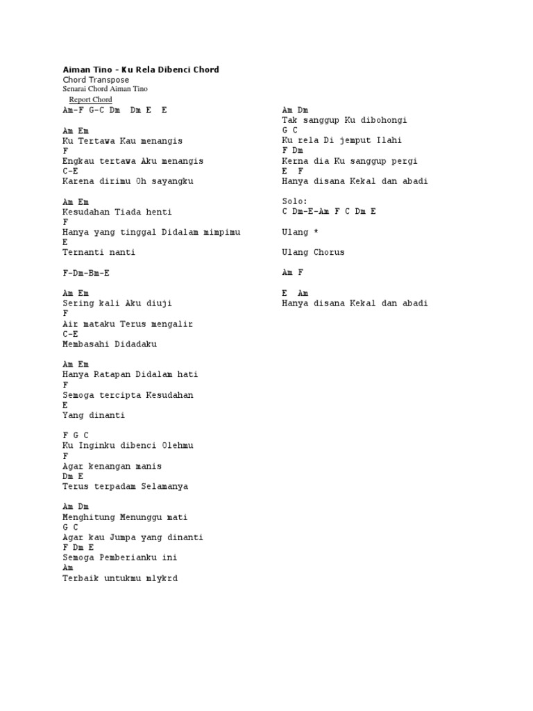 Am Untukku lupakan E Kisah yang terindah Am - G Sewaktu denganmu Dm Am Kini ku sendiri tanpamu F Dm E F - E Merindu belaianmu. Chord Kunci Gitar Dan Lirik Lagu Ku Rela Dibenci Aiman Tino Menghitung Menunggu Mati Tribun Solo. Lirik Lagu Aiman Tino Terlerai Sebuah Janji serta kunci gitar dan ukulele yang telah kami perbaharui.